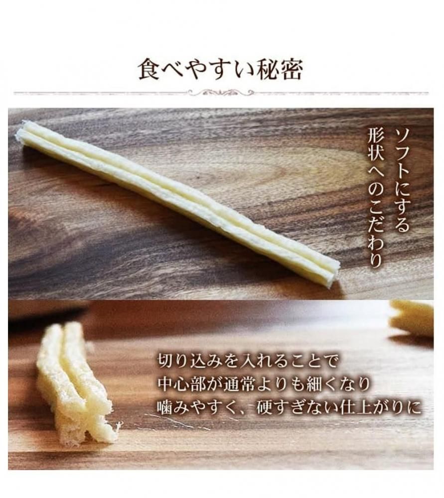 牛皮を細かく砕いてから再度形成することで、サクサクとした食感と適度な硬さになりました。子犬や老犬でも食べやすいですよ♪さらに、切り込みを入れることにより、中心部が通常よりもほそくなっていて硬すぎない形状になっています。